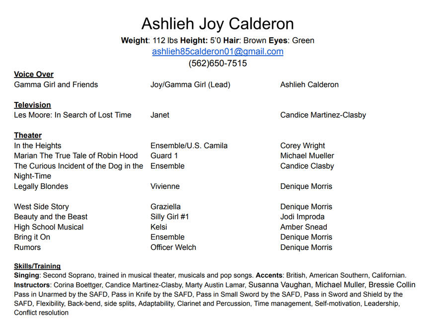Ashlieh is a versatile performer with experience in voice acting, musical theater, and stage performances. She has voiced the lead role in Gamma Girl and Friends and performed in shows like In the Heights and West Side Story. Trained in singing, accents, and stage combat, she also excels in leadership and conflict resolution, showcasing a well-rounded skill set.